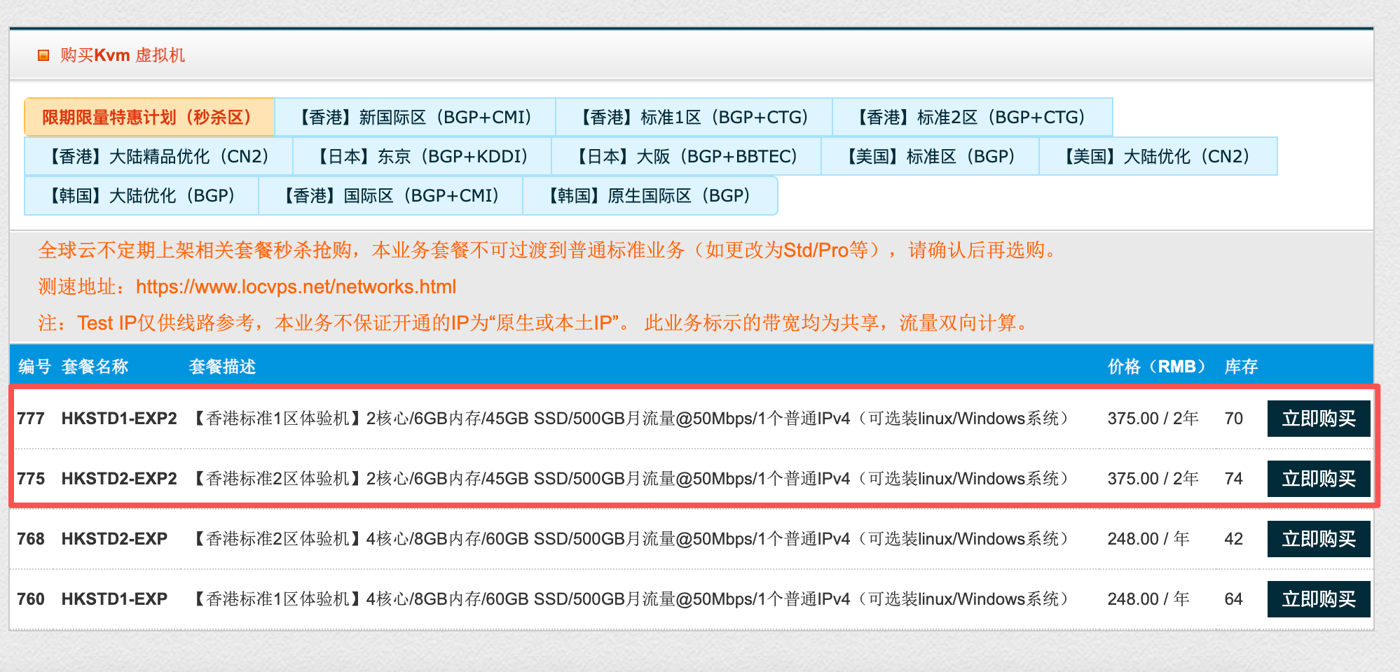 一、秒杀区特惠体验业务: HKSTD1 2核/6GB/45GB SSD/1TB/1个普通Ip/w...